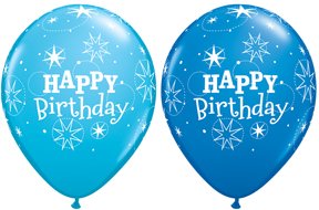 Six (6) 11" Happy Birthday Blue Sparkle latex balloons.